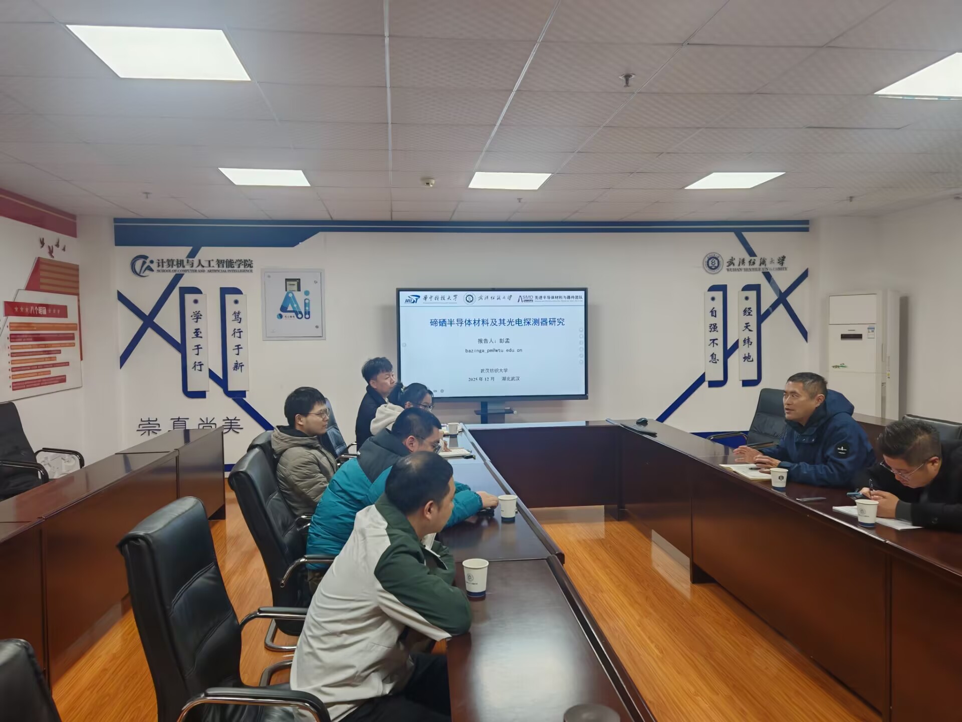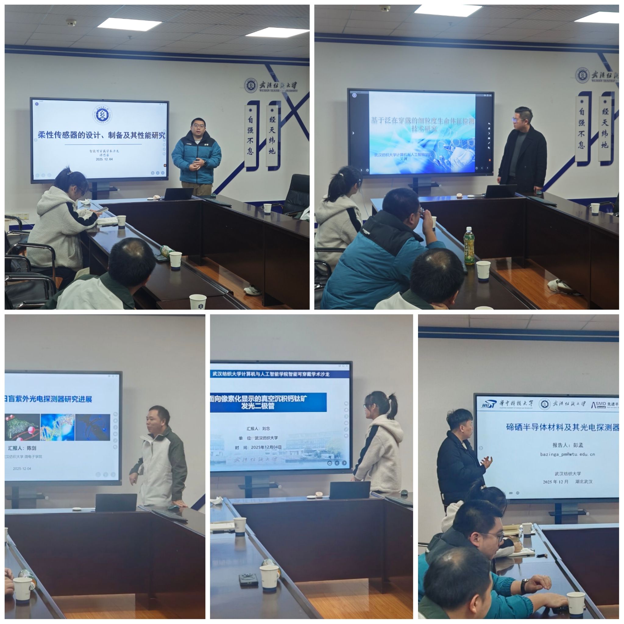 在会议中,五位老师围绕智能可穿戴技术及相关领域作了精彩报告。纺织学院谭思睿作题为“柔性压力传感器的设计、制备及其性能研究”的报告;微电子学院刘念、彭孟、陈建分别就钙钛矿发光二极管、碲硒半导体材料光电探测器、日盲紫外光电探测器等方向分享最新研究成果;计算机与人工智能学院吴渊作“基于泛在穿戴的细粒度生命体征检测技术研究”报告,系统阐述了可穿戴设备在健康监测领域的应用前景。