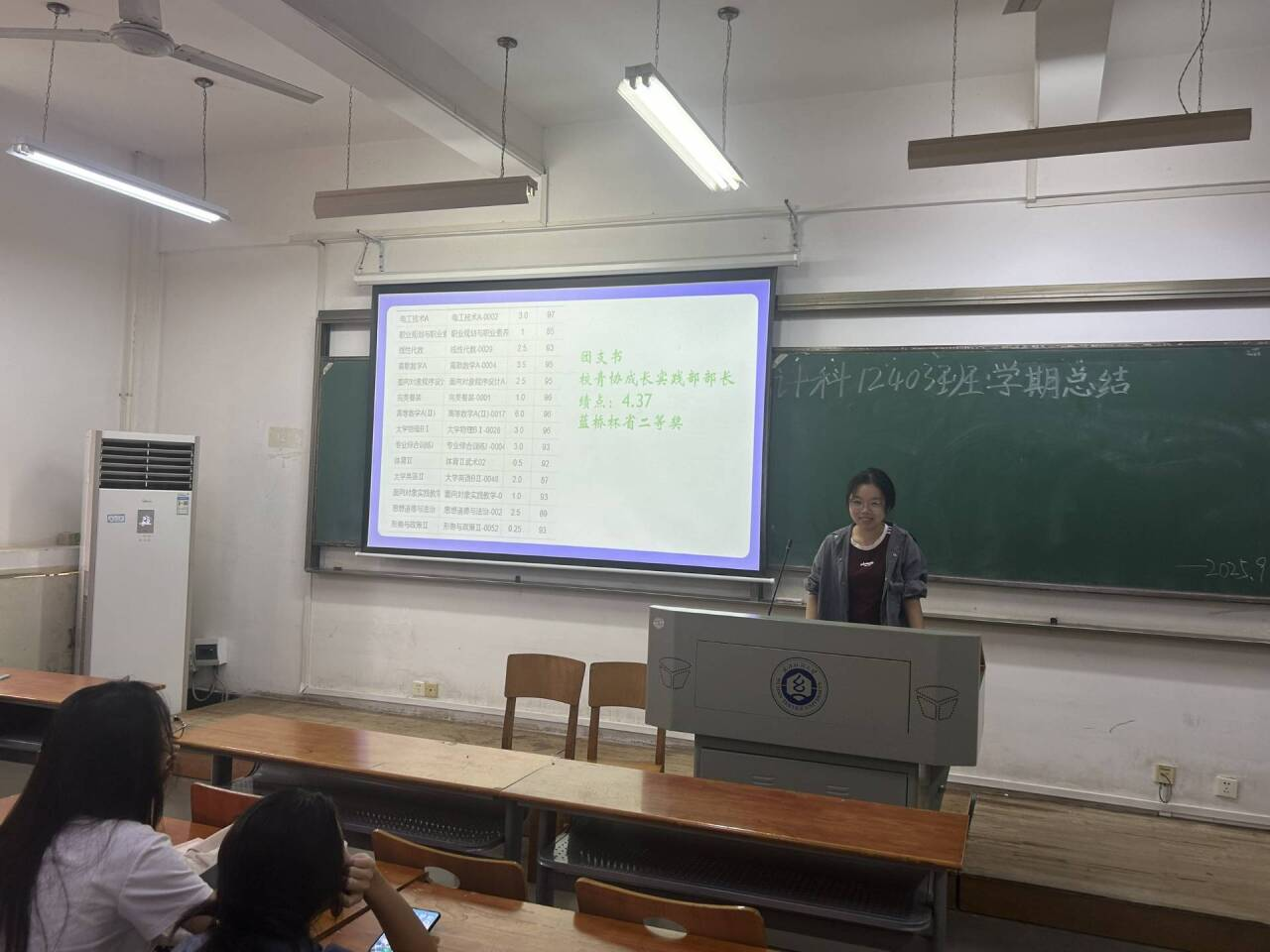 9月26日下午,计算机12403班在3号教学楼举行大一学年学期小结班会。班主任余锋、辅导员李港及全班同学共同参与,会议以宿舍为单位汇报上学期学习与生活情况,促进同学们了解不同寝室特点,互学互鉴。本次班会由班长庞翊航主持。