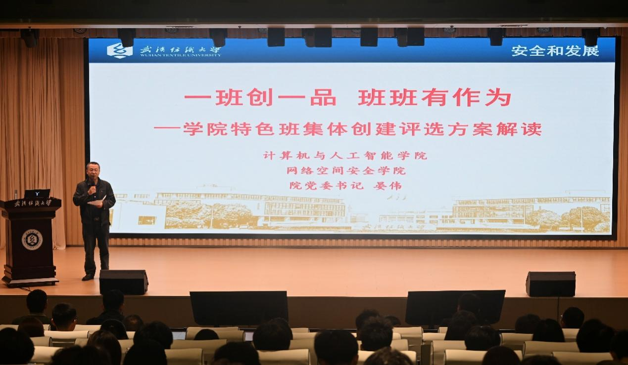 仪式伊始,院党委书记晏伟以“一班创一品,班班有作为”主题,对特色班集体创建评选方案作出全面解读。他用“以评促建、评建结合”八个字为活动定下基调,清晰勾勒出五大特色方向:思想政治建设类(AI崇真班)、文体活动类(AI尚美班)、学风建设类(AI笃行班)、学科竞赛类(AI致远班)、志愿服务与社会实践类(AI力行班)五大特色方向。晏伟强调,五条并行的“成长赛道”,为不同禀赋、不同志向的班级提供了奔跑的舞台。同时,他阐释了全流程安排与多维评选标准,并明确学院将配套专项经费与荣誉激励。