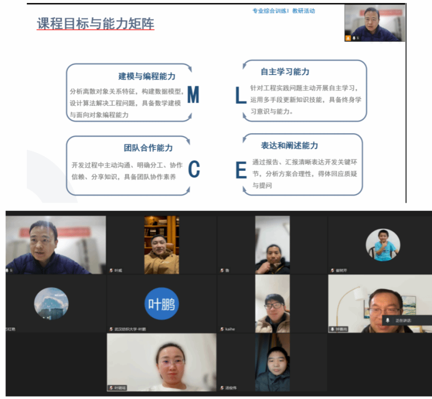 1月21日,计算机与人工智能学院《专业综合训练I》课程组召开线上教学研讨会。课程组全体教师围绕“课程目标落地、训练内容提质、第三学期教学模式创新”等议题深入研讨、各抒己见,明确分工与实施思路,凝聚教学共识。