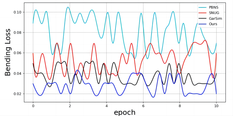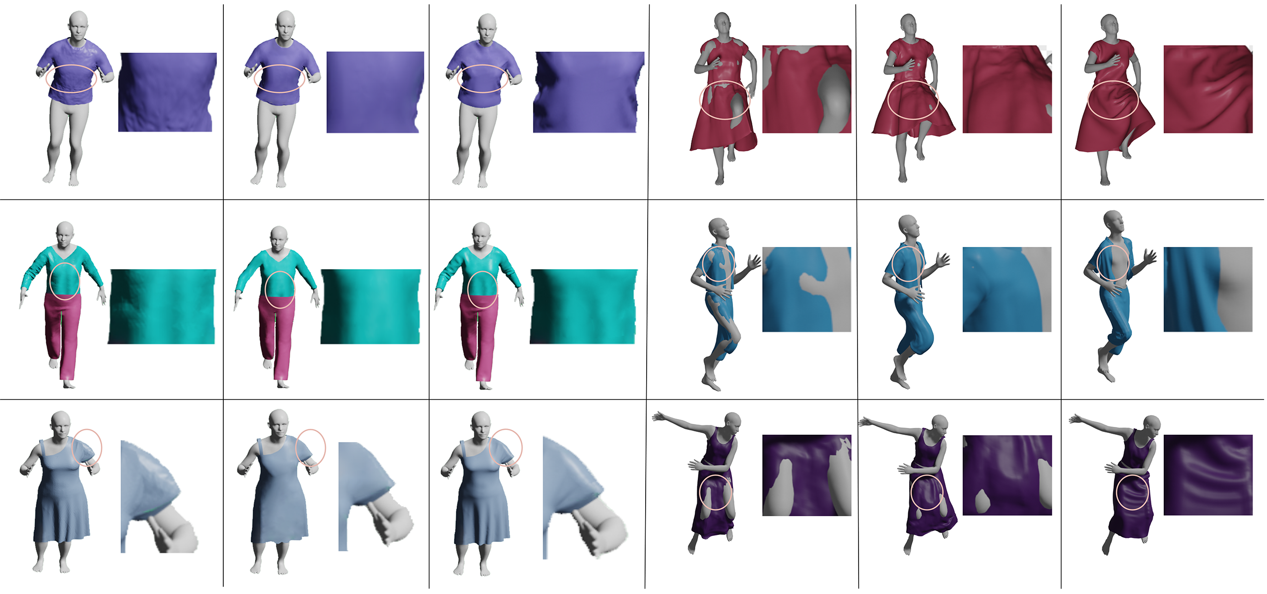 We have compared the physical terms with and without our physical garment model. The table shows that our method produces deformations more in line with the physics-based simulator. As well as validating the superiority of the loss combination.