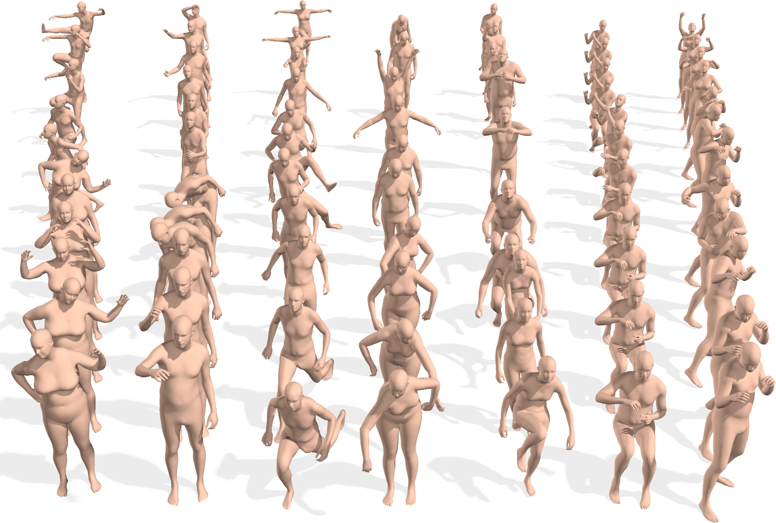 The AMASS dataset contains 40 hours of motion capture, 344 subjects, and 11,265 motions. The original datasets that comprise the AMASS dataset have 37 to 91 distributed motion capture markers. Each frame in the AMASS dataset includes SMPL 3D shape parameters (16 dimensions), DMPL soft tissue coefficients (8 dimensions), and complete SMPL pose parameters (159 dimensions), including hand joints and global translations of the body.