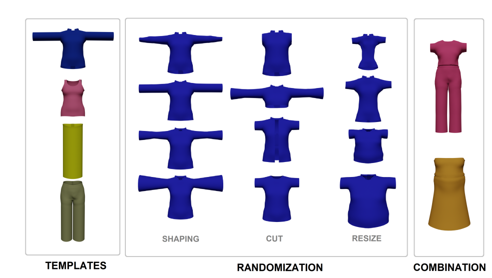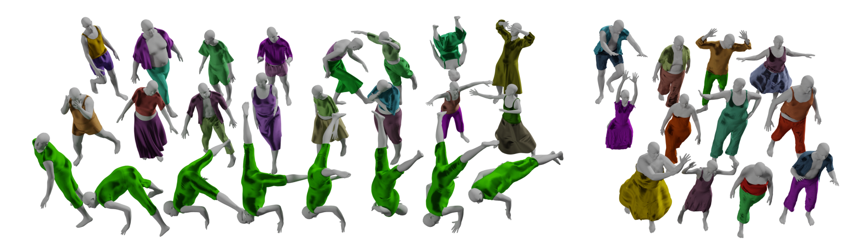The CLOTH3D dataset synthesizes a large amount of dressed human body data by combining garments of various styles and generating motion sequences based on physical simulation using the SMPL human body model. The resulting dataset is then rendered into corresponding images.