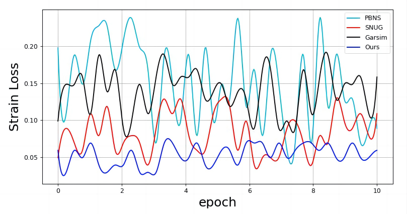 We evaluate the errors using different physics and show that our model is better than GarSim, PBNS and SNUG in most cases.
